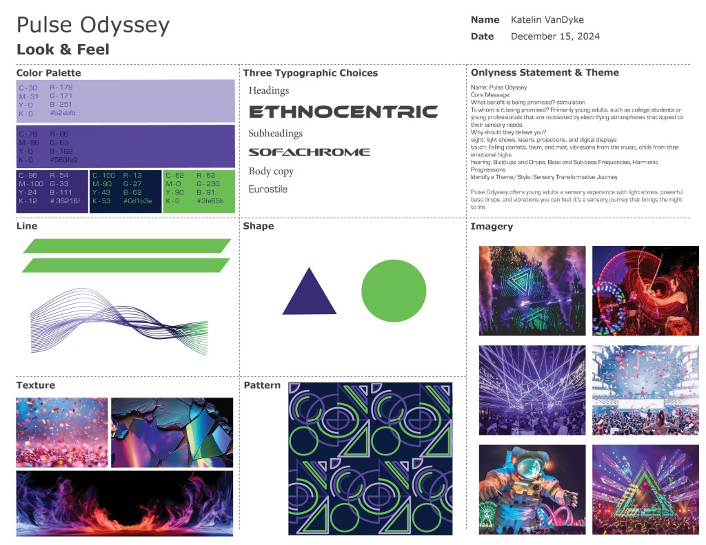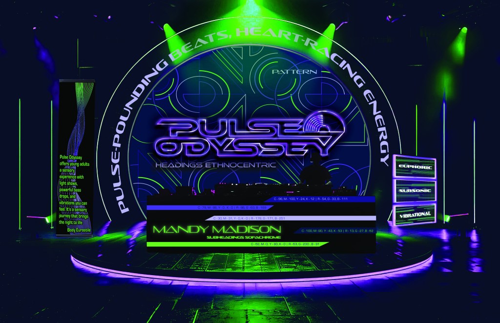 There was also a suggestion to think more critically about how each image contributes to the larger narrative. This ensures each visual fits aesthetically. It reinforces the themes of energy, immersion, and individuality that Pulse Odyssey is built on (Das, 2023). The feedback emphasized that a vision board isn’t just a collage. It serves as a strategic communication tool. It is designed to establish tone, direction, and creative intent with immediate impact (Frascara, 2004).