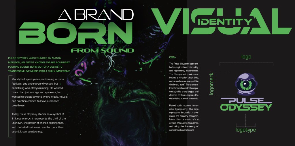 The feedback from the instructor highlighted the strength of the Pulse Odyssey brand identity in concept. Peers also acknowledged its strength in execution. The instructor emphasized how effectively the branding conveyed an immersive, high-energy experience, noting that the system did not rely solely on standalone visuals but worked cohesively across formats to support a strong, unified identity (VistaCreate, n.d.). This reinforced the importance of consistency in voice, visuals, and storytelling as the brand moved toward finalization. It also reminded us that refinement is an ongoing part of the creative process. Iteration plays a key role in shaping a resolved, professional brand system (Frascara, 2004).