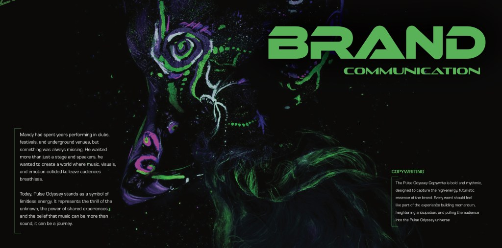 I learned how to use color to evoke emotion and build atmosphere, especially within subcultures like EDM. For Pulse Odyssey, I selected neon green and purple for their cultural resonance and their ability to glow in dark environments, creating visual intensity across media. Applying color consistently across digital, print, and merch highlighted the challenges of translating neon into physical formats, prompting refinements for accessibility and practicality. This deepened my understanding of color’s technical and emotional roles in brand design. In my career, this ensures I can craft color systems that are both visually impactful and production-ready across any platform.