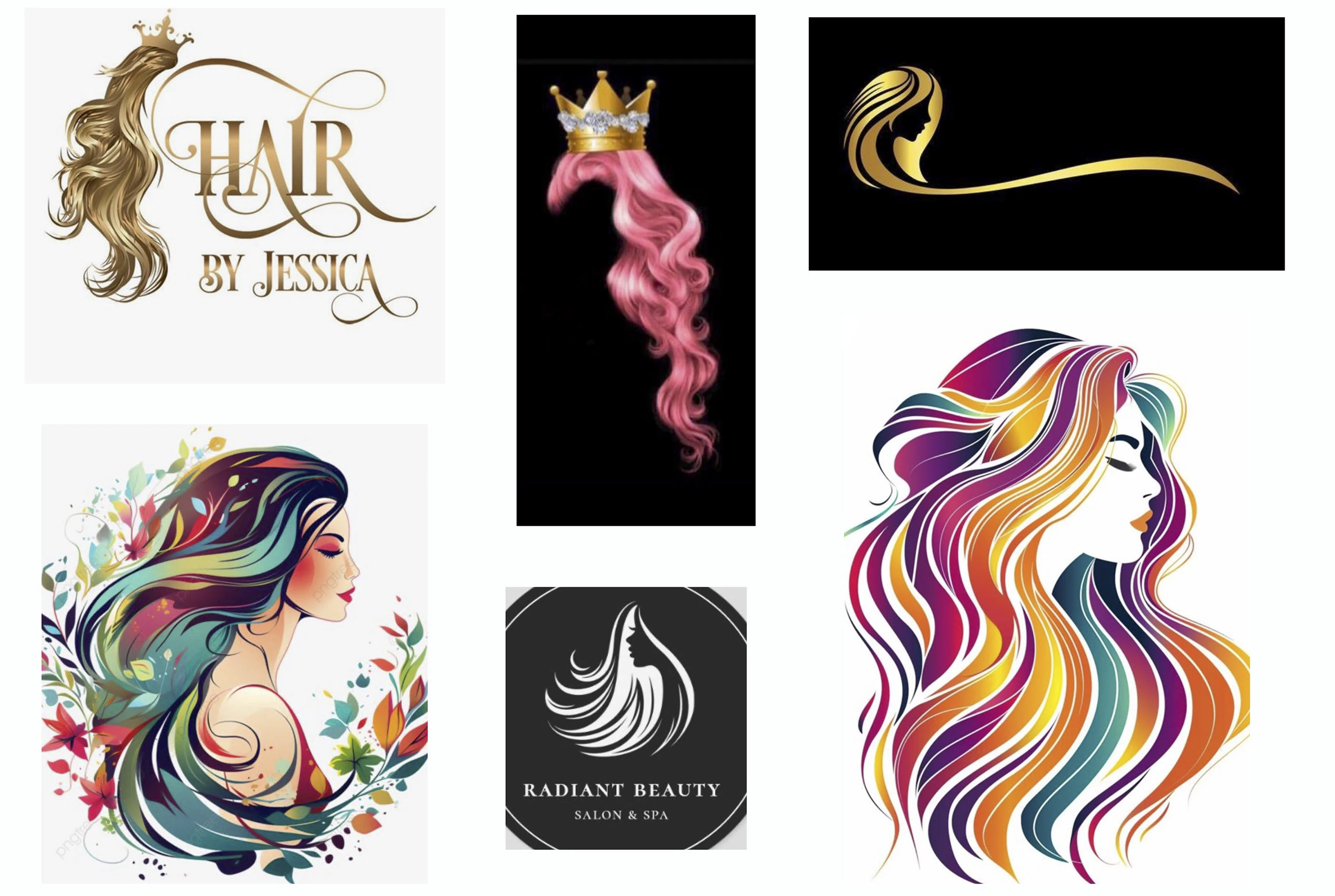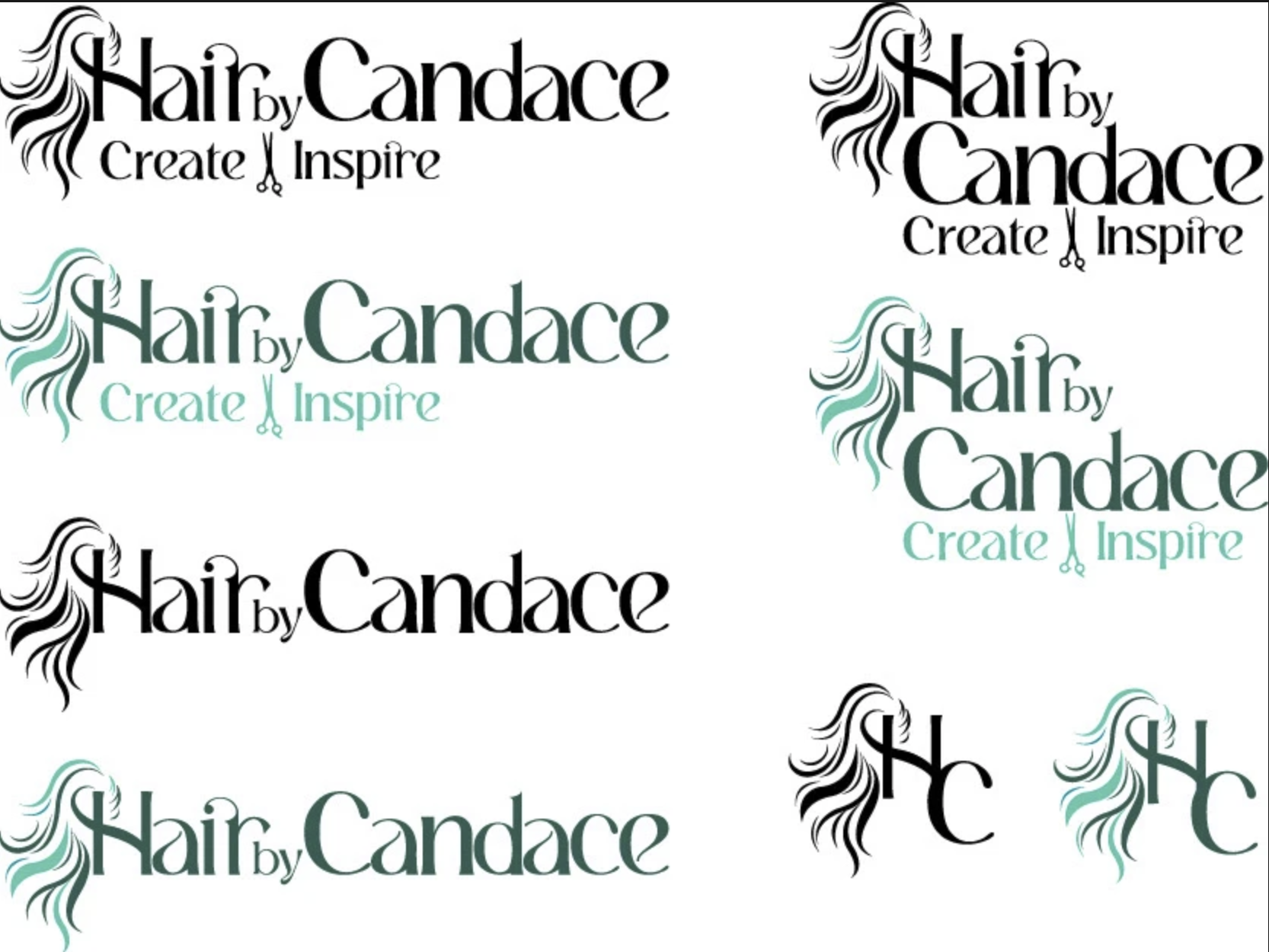 Candace provided a collection of inspiration images (see reference) that leaned heavily into feminine silhouettes, flowing hair graphics, crowns, and vibrant color palettes. These references informed the direction for early concepts: one leaning into minimalist monogram styles with scissors integrated into the letterforms, and another incorporating stylized hair strands and soft, modern typography
