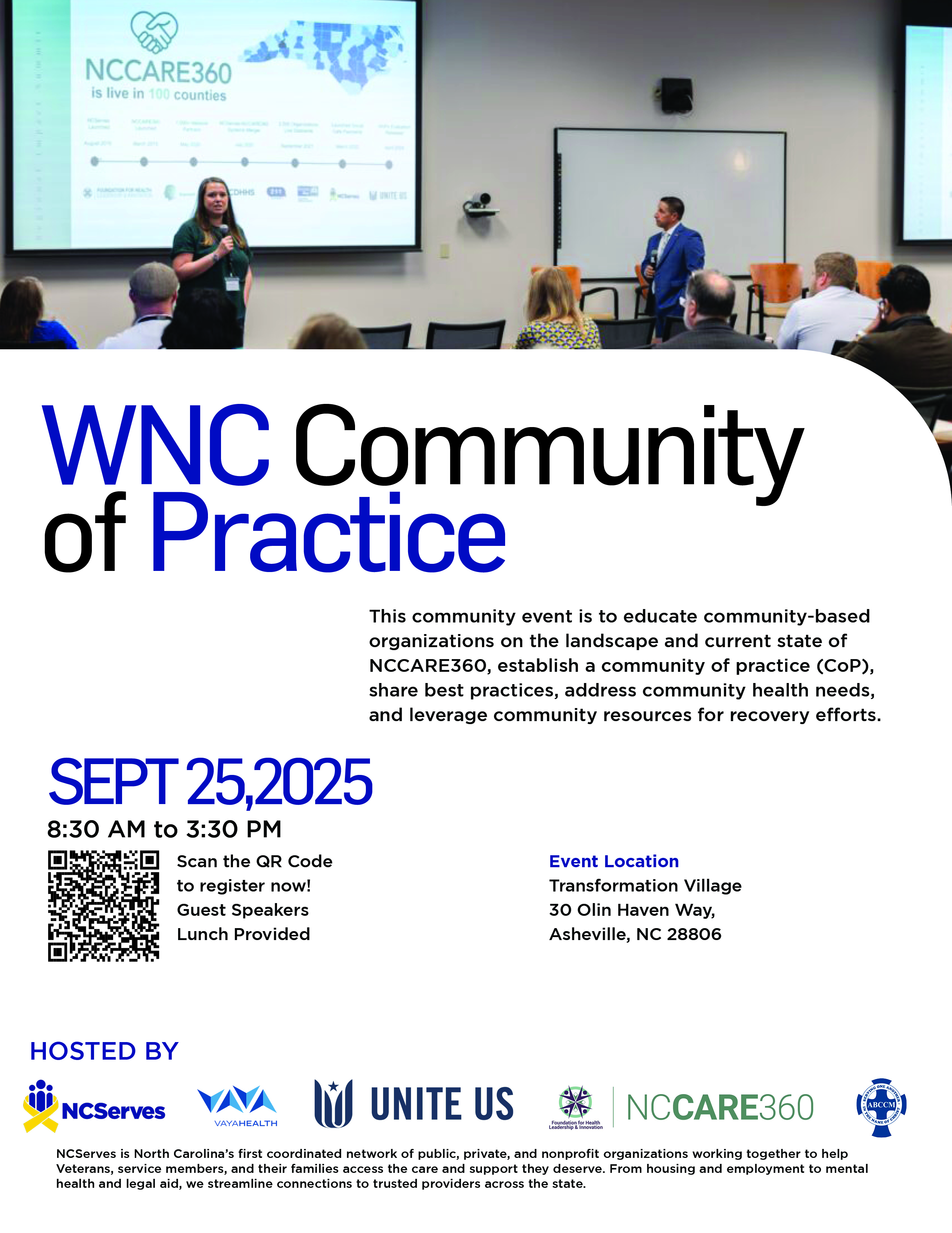 The WNC Community of Practice brings together Veteran service providers, partners, and stakeholders across Western North Carolina for education, networking, and collaboration. Create a cohesive visual identity for the event that works seamlessly across every touchpoint. from the first social media post to the final program handout, while building excitement and reinforcing community connection.